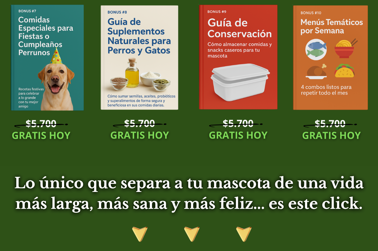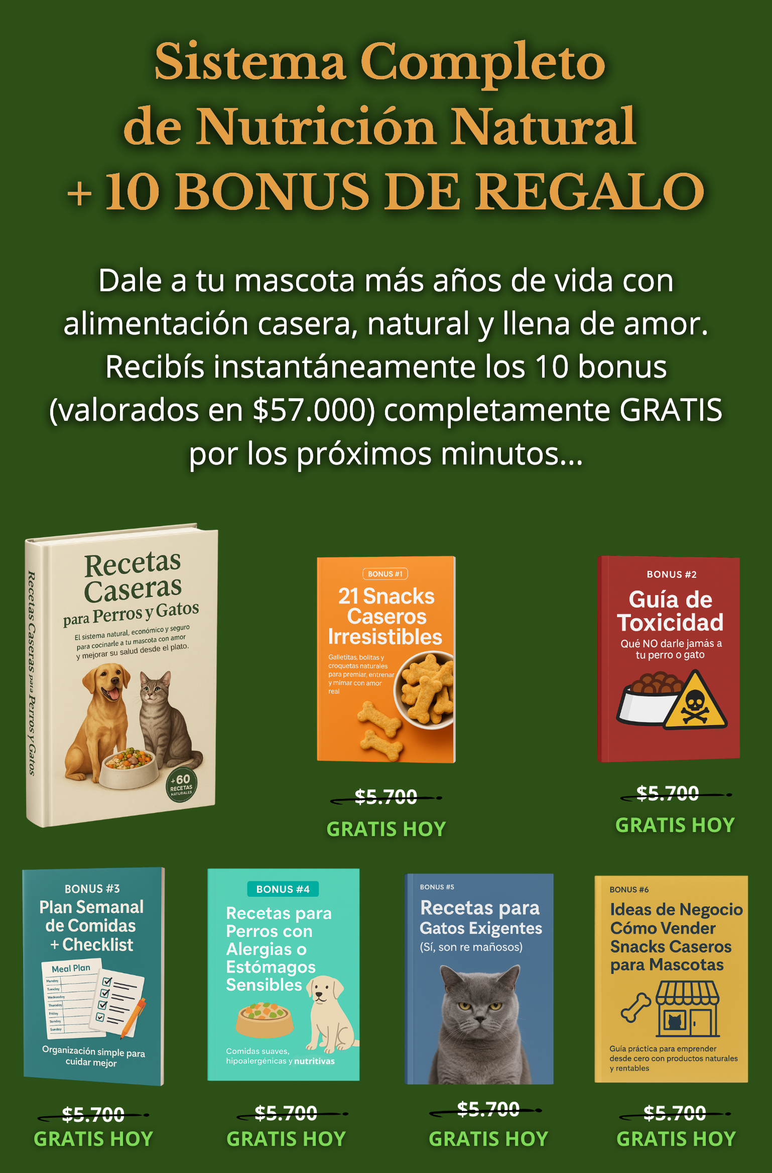 - BONUS: Podrás generar $200.000-$400.000 extra por mes vendiendo snacks caseros que las personas BUSCAN desesperadamente para sus mascotas (con plan legal completo incluido).